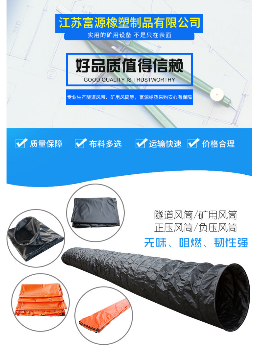 风筒品种:风筒按涂覆布材料分为橡胶涂覆布正压风筒、塑料涂覆布正压风筒和橡塑涂覆布正压风筒。
